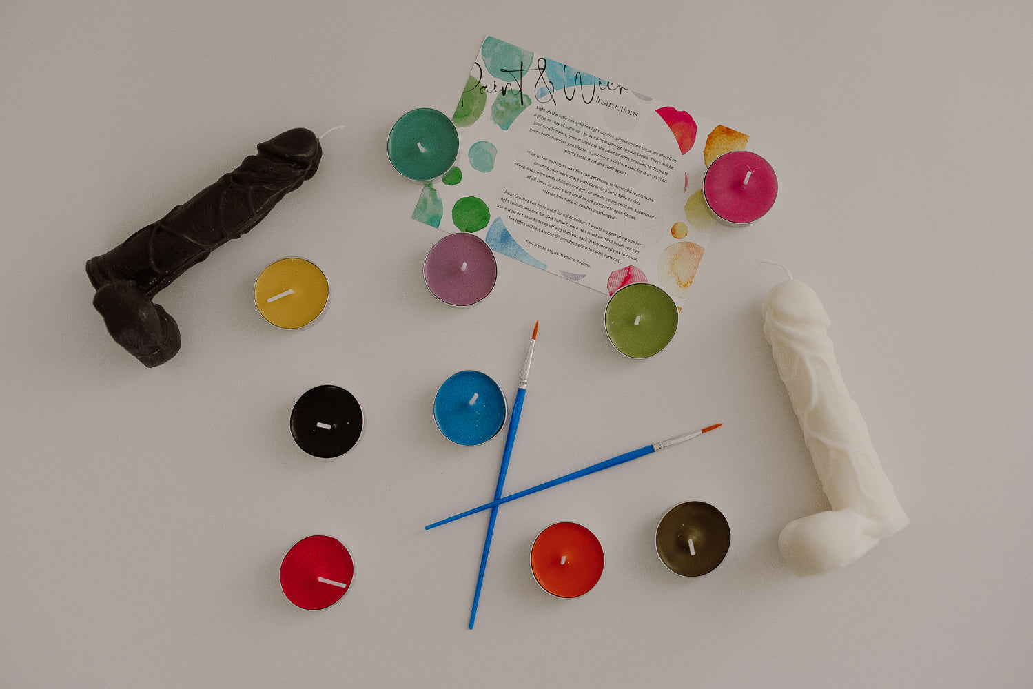 Light all the little coloured tea light candles please ensure these are placed on a plate or tray of some sort to avoid heat damage to your tables and these will be your candle paints, once melted use the paint brushes provided to decorate your taper candle however you please, if you make a mistake wait for it to set then simply scrap it off and start again!!