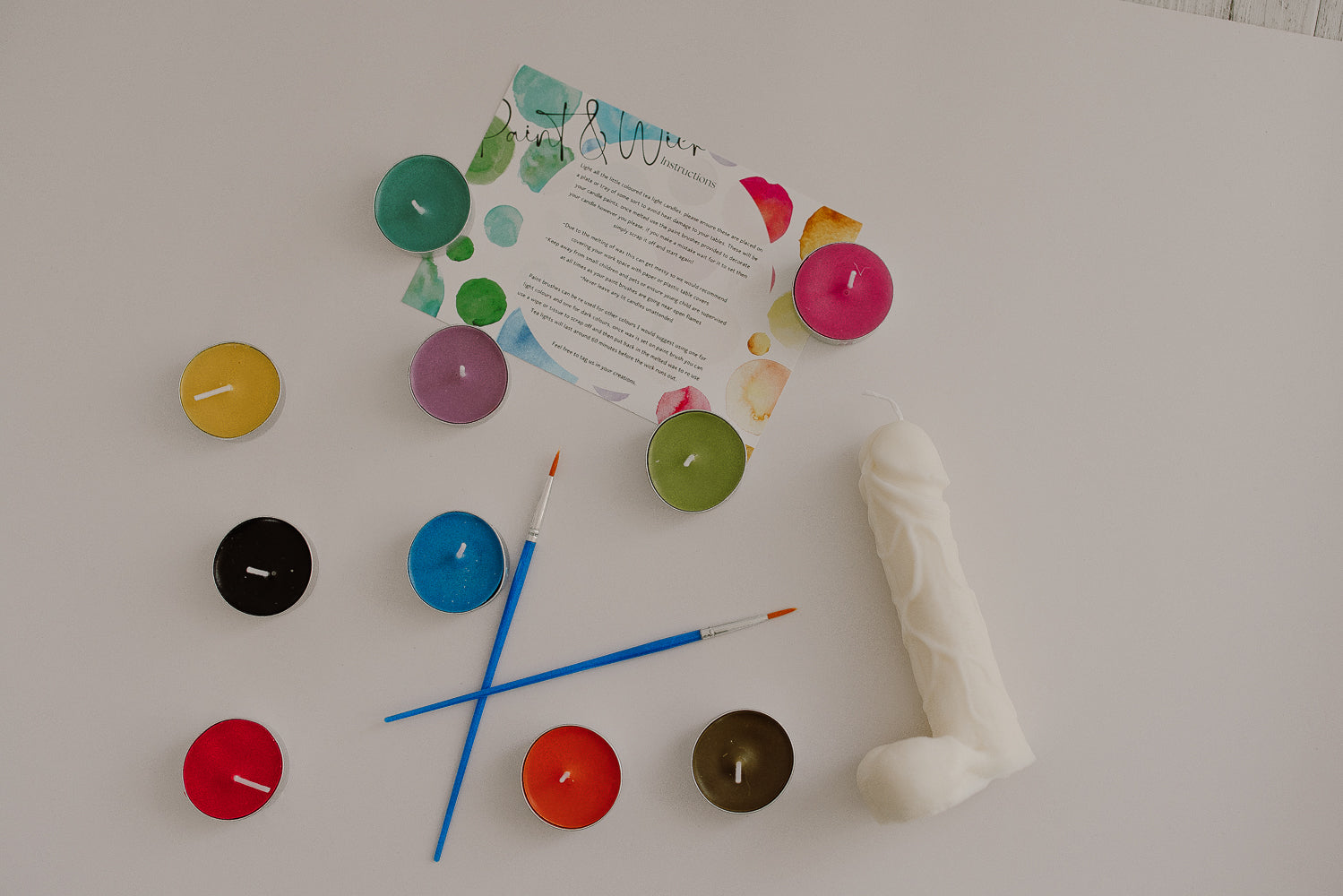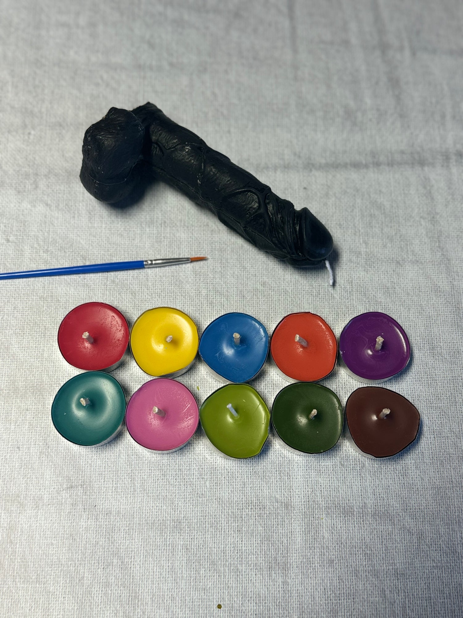 Light all the little coloured tea light candles please ensure these are placed on a plate or tray of some sort to avoid heat damage to your tables and these will be your candle paints, once melted use the paint brushes provided to decorate your taper candle however you please, if you make a mistake wait for it to set then simply scrap it off and start again!!