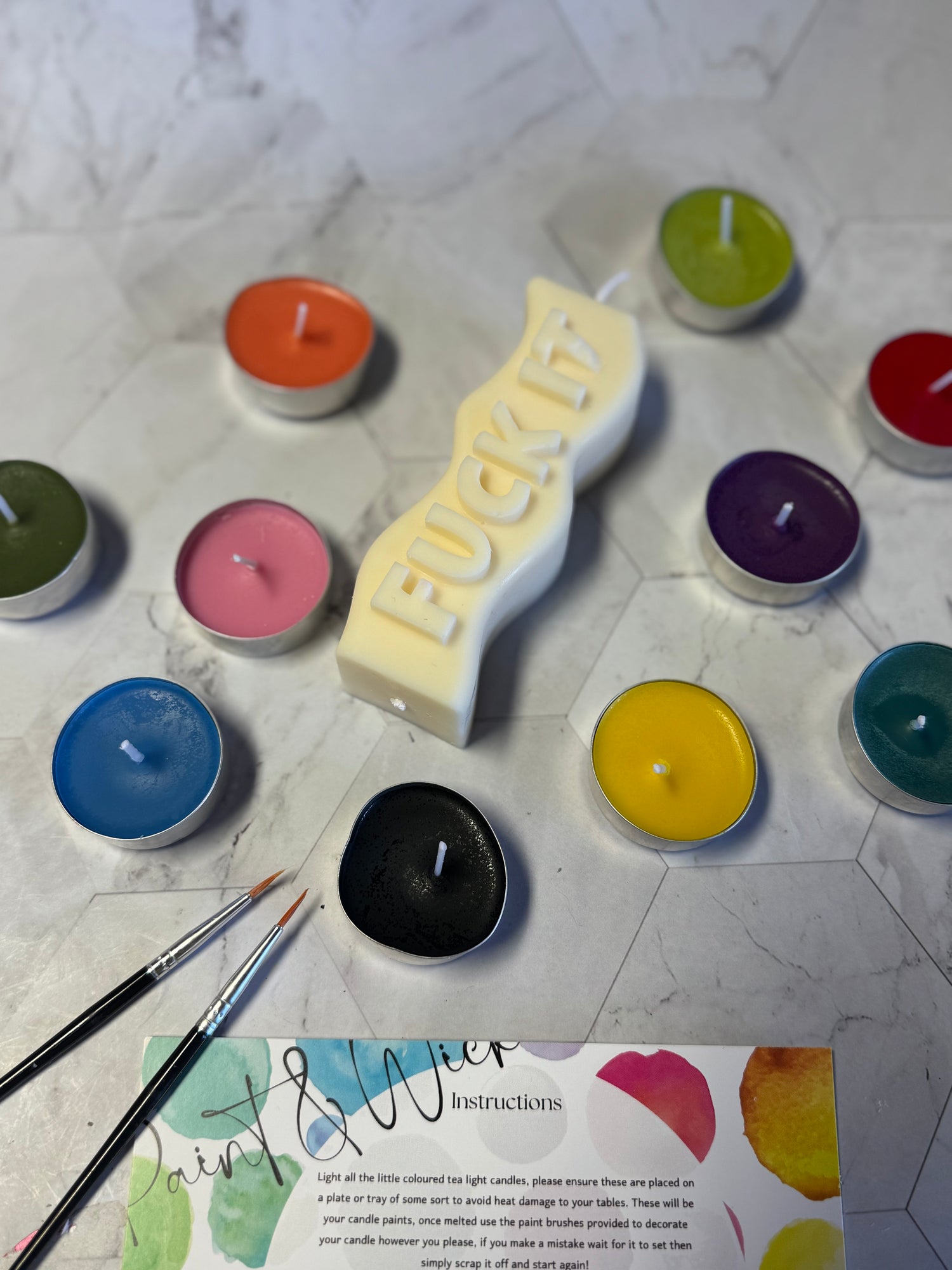 Light all the little coloured tea light candles please ensure these are placed on a plate or tray of some sort to avoid heat damage to your tables and these will be your candle paints, once melted use the paint brushes provided to decorate your taper candle however you please, if you make a mistake wait for it to set then simply scrap it off and start again!!