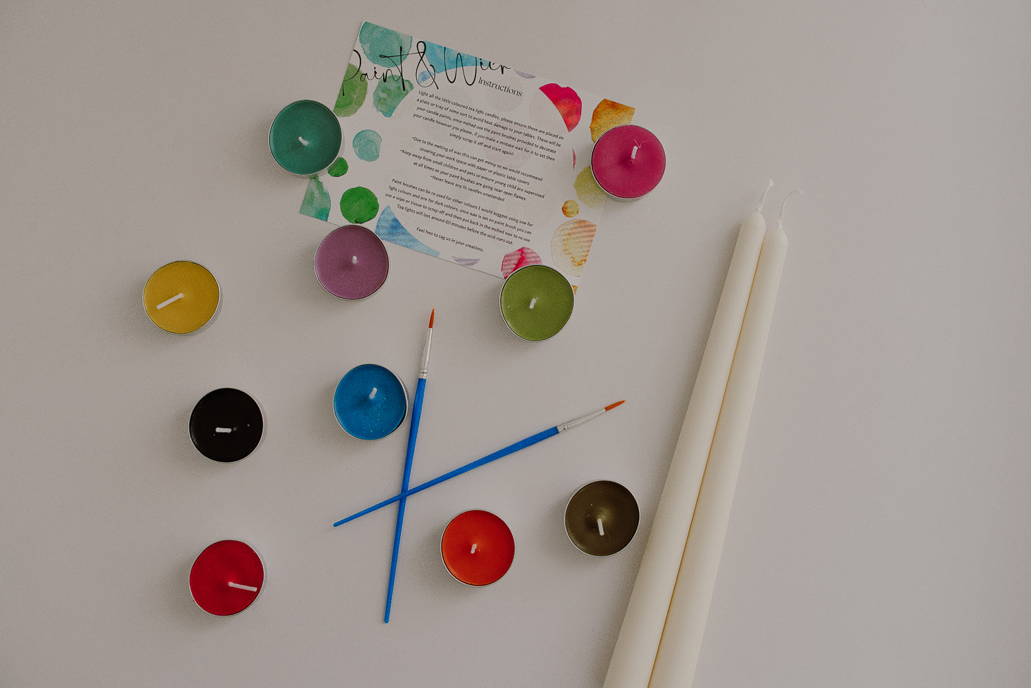 Light all the little coloured tea light candles please ensure these are placed on a plate or tray of some sort to avoid heat damage to your tables and these will be your candle paints, once melted use the paint brushes provided to decorate your taper candle however you please, if you make a mistake wait for it to set then simply scrap it off and start again!!