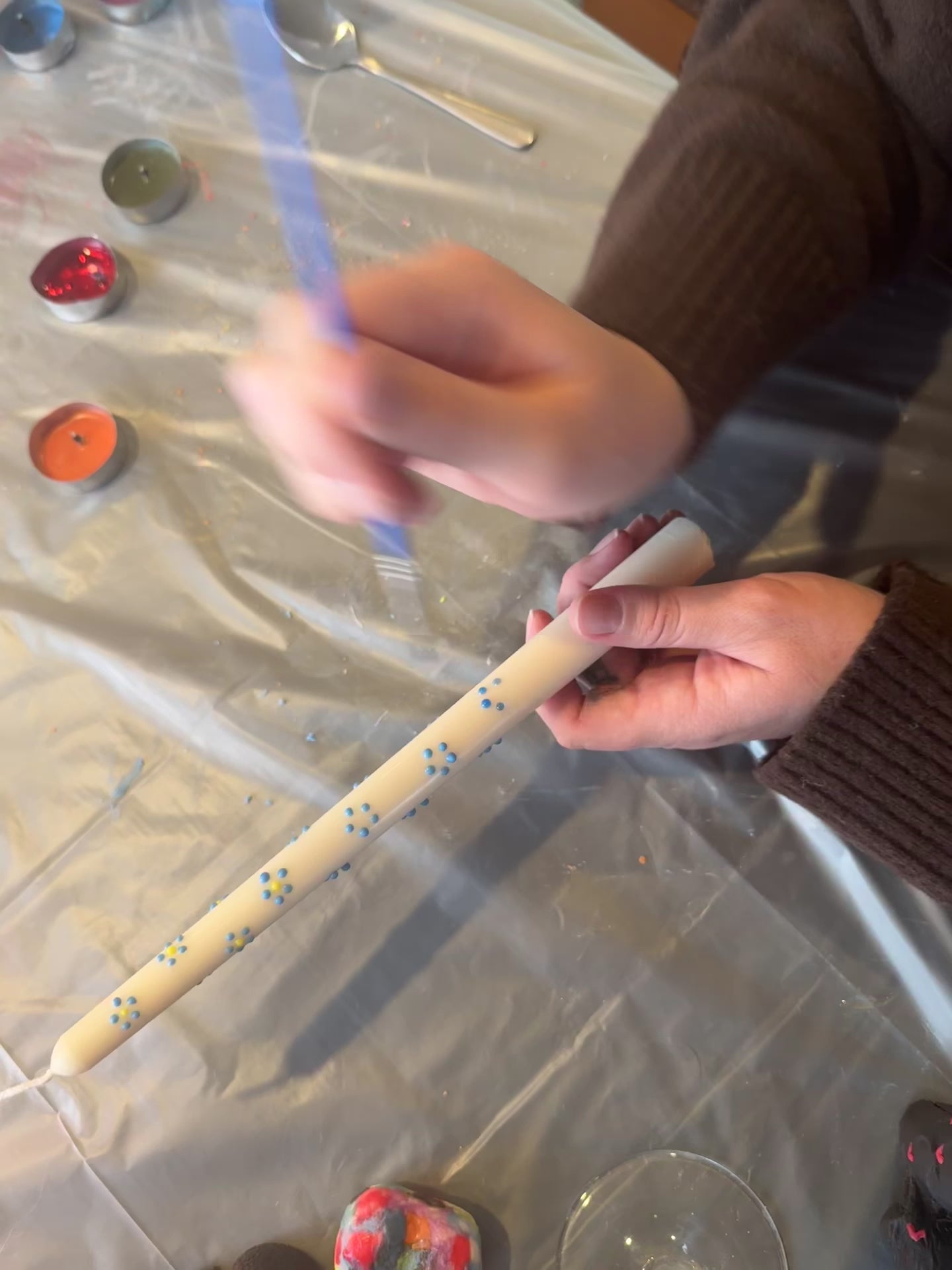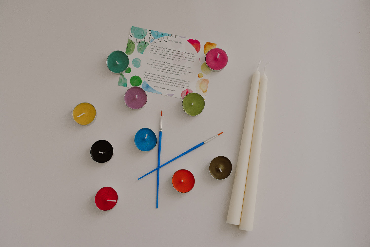 Light all the little coloured tea light candles please ensure these are placed on a plate or tray of some sort to avoid heat damage to your tables and these will be your candle paints, once melted use the paint brushes provided to decorate your taper candle however you please, if you make a mistake wait for it to set then simply scrap it off and start again!!
